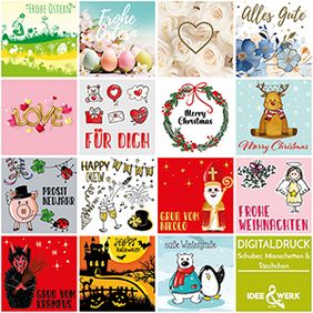 Wählen Sie zusätzlich zu unserem saisonal dekorierten Kreativsortiment, aus einer Auswahl an Digitaldruck-Manschetten (für CLASSIC KLAR & PREMIUM) und -Schubern (für CLASSIC EDITION), sowie Täschchen das richtige Motiv für jeden Anlass: